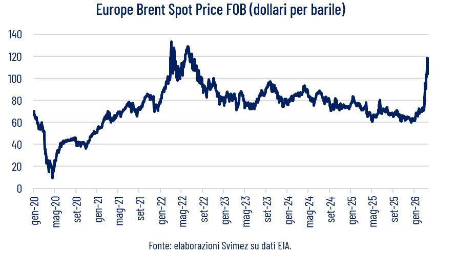 L’impatto diretto della guerra si è manifestato innanzitutto attraverso i rilevanti aumenti che hanno interessato il Brent – l’indice di riferimento del petrolio in Europa – e il prezzo del gas sul mercato europeo del Title Transfer Facility (TTF). Il petrolio ha toccato un valore massimo di oltre 115 dollari a fine marzo, con una media mensile di 96,6 dollari al barile e un incremento del 39,7% sul valore medio del 2025, avvicinandosi alle quotazioni massime toccate nel 2022 a seguito dell’invasione russa dell’Ucraina. Il TTF stazionava a marzo tra i 50 e i 55 €/MWh, con una media mensile di 53 €/MWh, ben lontana dai picchi del 2022-2023, ma in aumento del +46,3% rispetto alla media del 2025. Dopo l’annuncio del cessate il fuoco, il Brent si è riportato sotto quota 100 e il TTF ha ripiegato intorno ai 45 €/MWh.